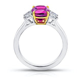 3.18 carat red cushion ruby with trapezoid diamonds .69 carats set in a platinum with 18k yellow gold ring