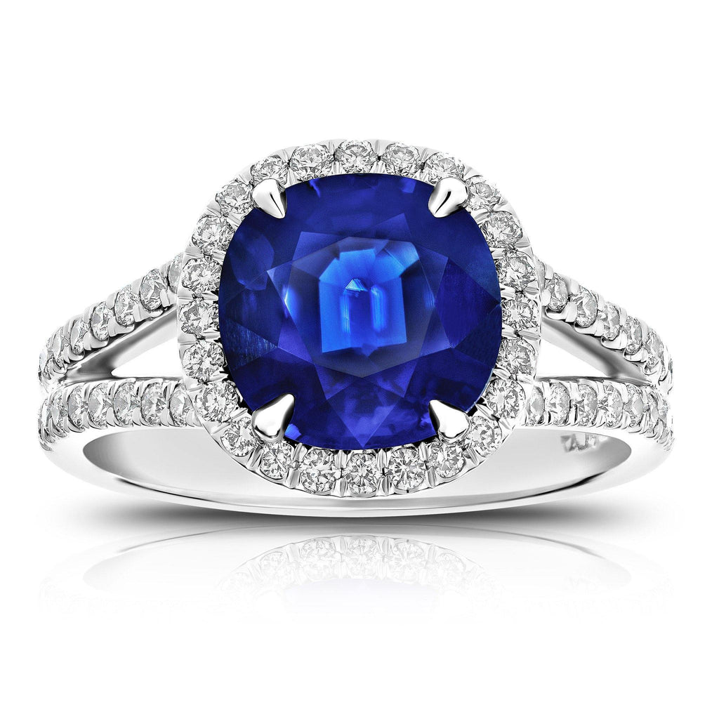 Details3.18 carat cushion cut Blue Sapphire Ring in a Halo setting, with 60 round diamonds weighing 0.57 carats