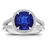 3.18 carat cushion cut Blue Sapphire Ring in a Halo setting, with 60 round diamonds weighing 0.57 carats