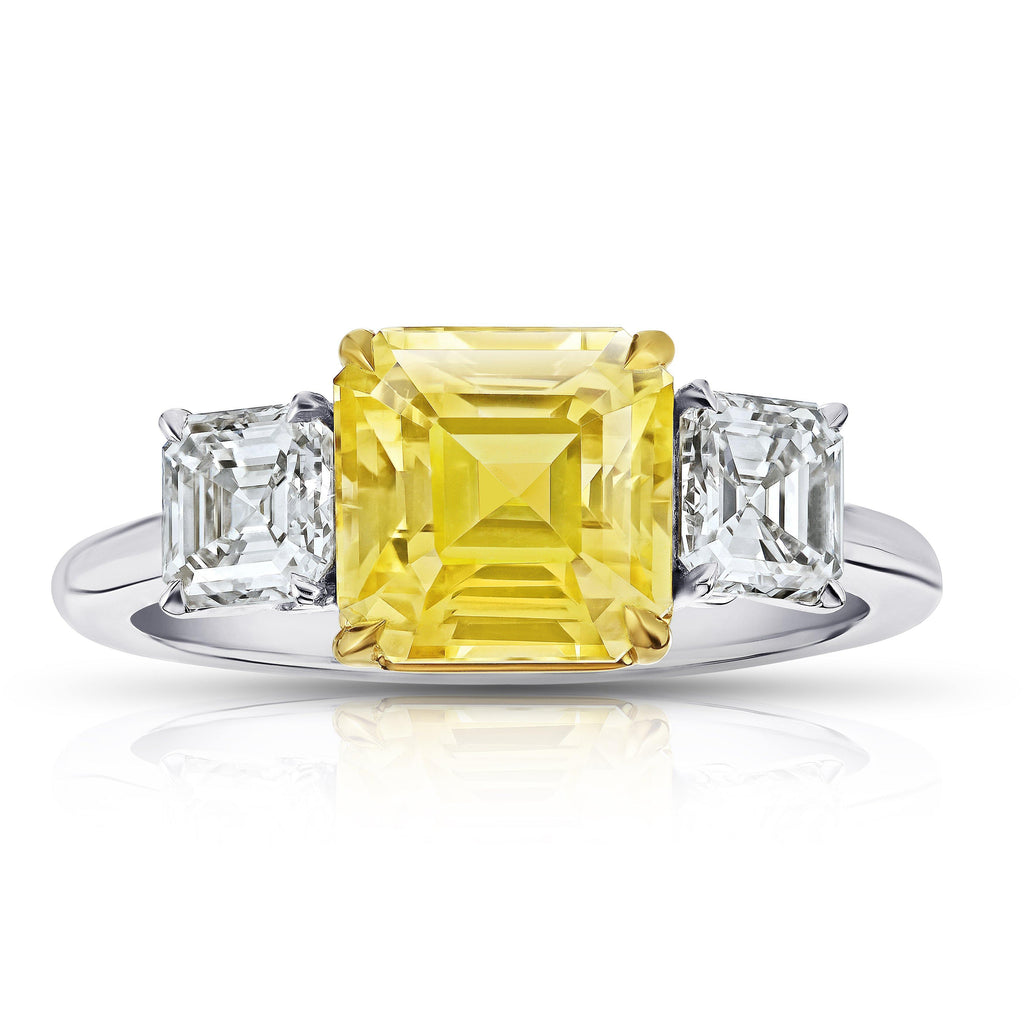 3.48 carat square emerald cut yellow sapphire with square emerald cut diamonds 1.03 carats set in a platinum with 18k yellow gold ring