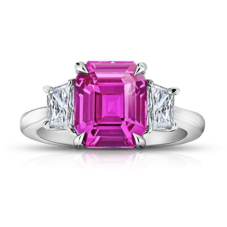 Details4.37 carat emerald cut pink sapphire with Trapezoid diamonds .73 carats set in a platinum ring
