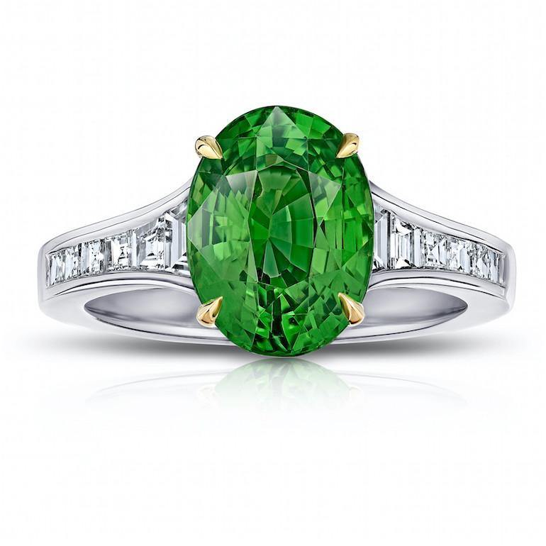 4.37 carat oval green tsavorite (no heat) with 4 trapezoid diamonds .44 carats and 8 square emerald cut diamonds .28 carats set in a platinum and 18k yellow gold ring