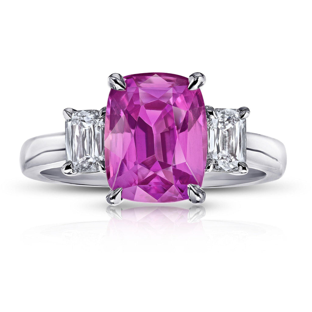 Details4.37 carat pink cushion sapphire with .70 carats of cushion cut diamonds set in platinum ring.