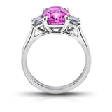4.37 carat pink cushion sapphire with .70 carats of cushion cut diamonds set in platinum ring.