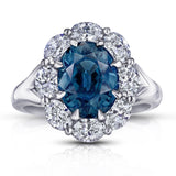 Details4.63 carat oval greenish blue sapphire with 8 oval diamonds 1.66 carats set in platinum princess diana split shank ring. |