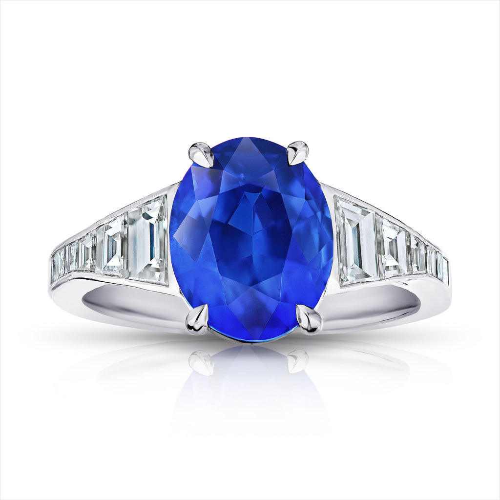 4.91 carat oval blue sapphire with six trapezoid step cut diamonds .83 carats and 10 carre diamonds .30 carats set in a platinum ring.