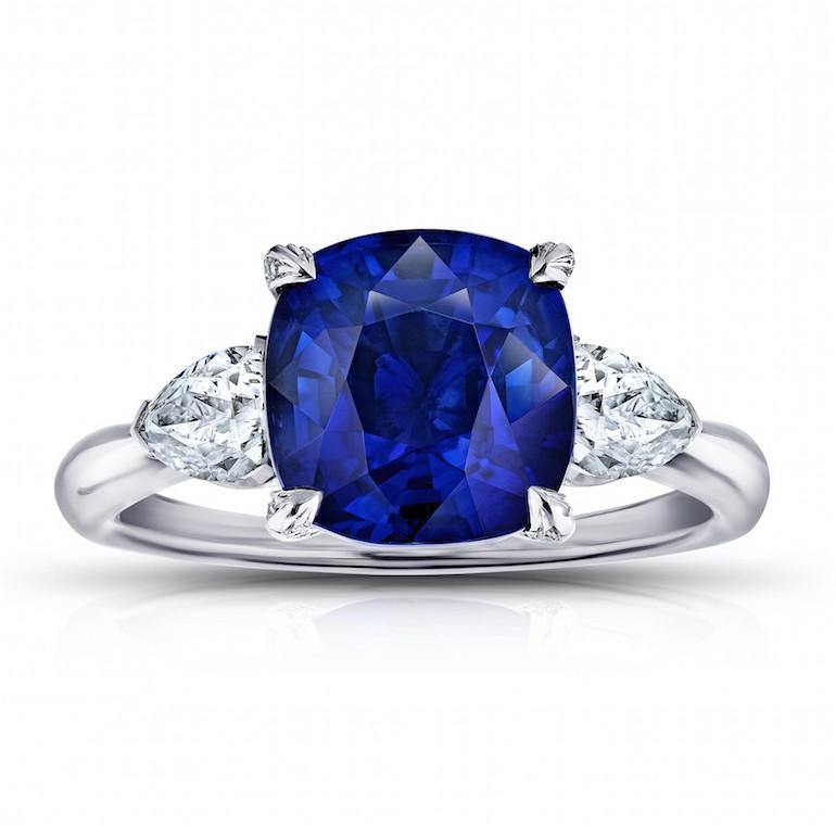 Details5.03 carat cushion blue sapphire with 2 shield cut diamonds .62 carats and 48 round diamonds .16 carats set in a platinum ring