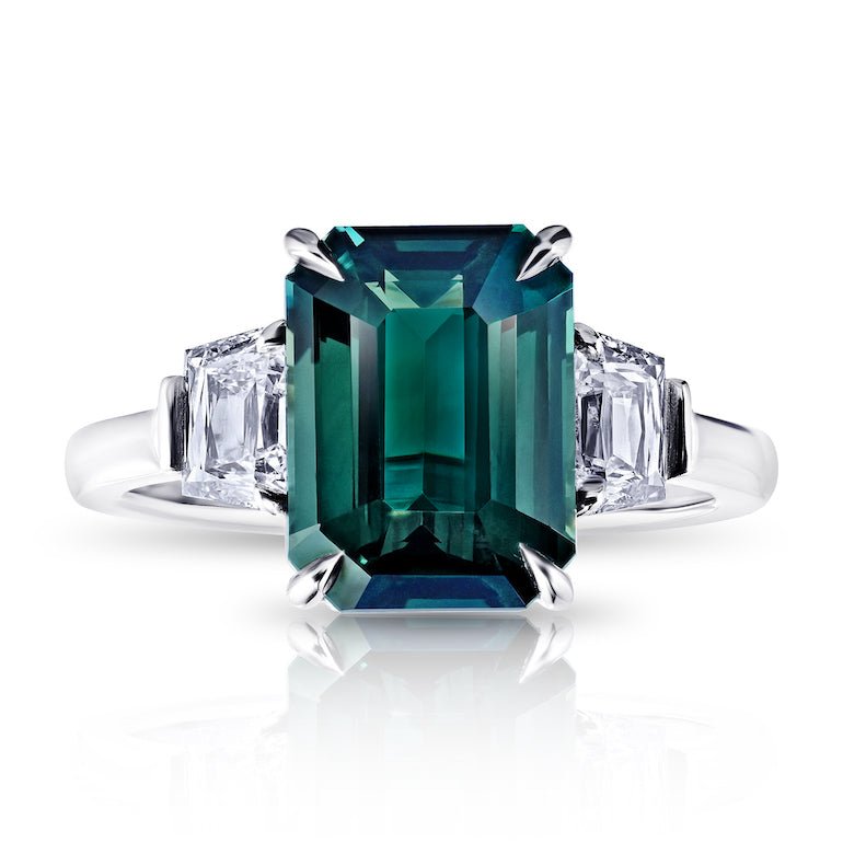 5.07 CT Emerald Green Sapphire with Trapezoid Diamonds .89 carats set in a Platinum ring