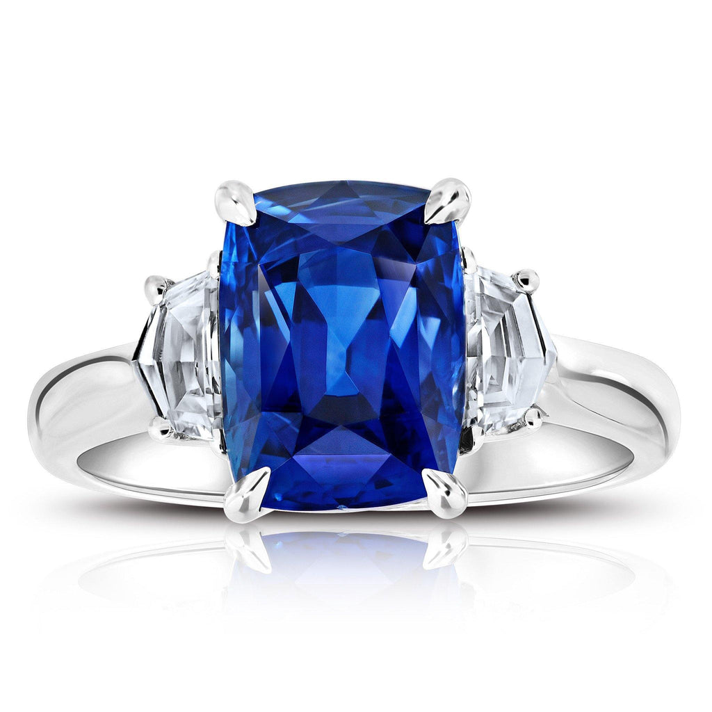 Details5.62 carat (No Heat) Cushion Blue Sapphire Ring with Trapezoid shape diamonds weighing 0.49 carats