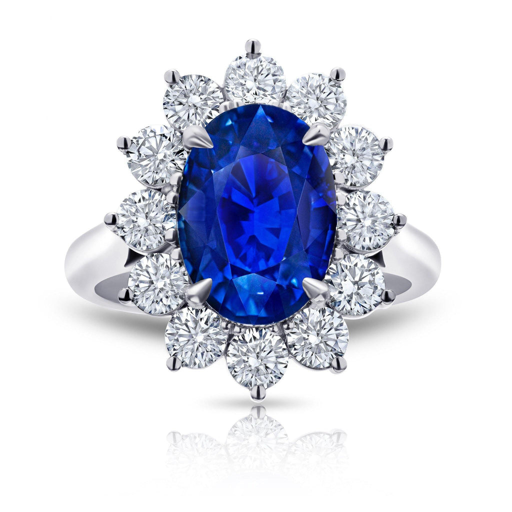 5.87 carat Blue Sapphire Princess Diana Ring with 12 Round Diamonds weighing 1.83 carats.