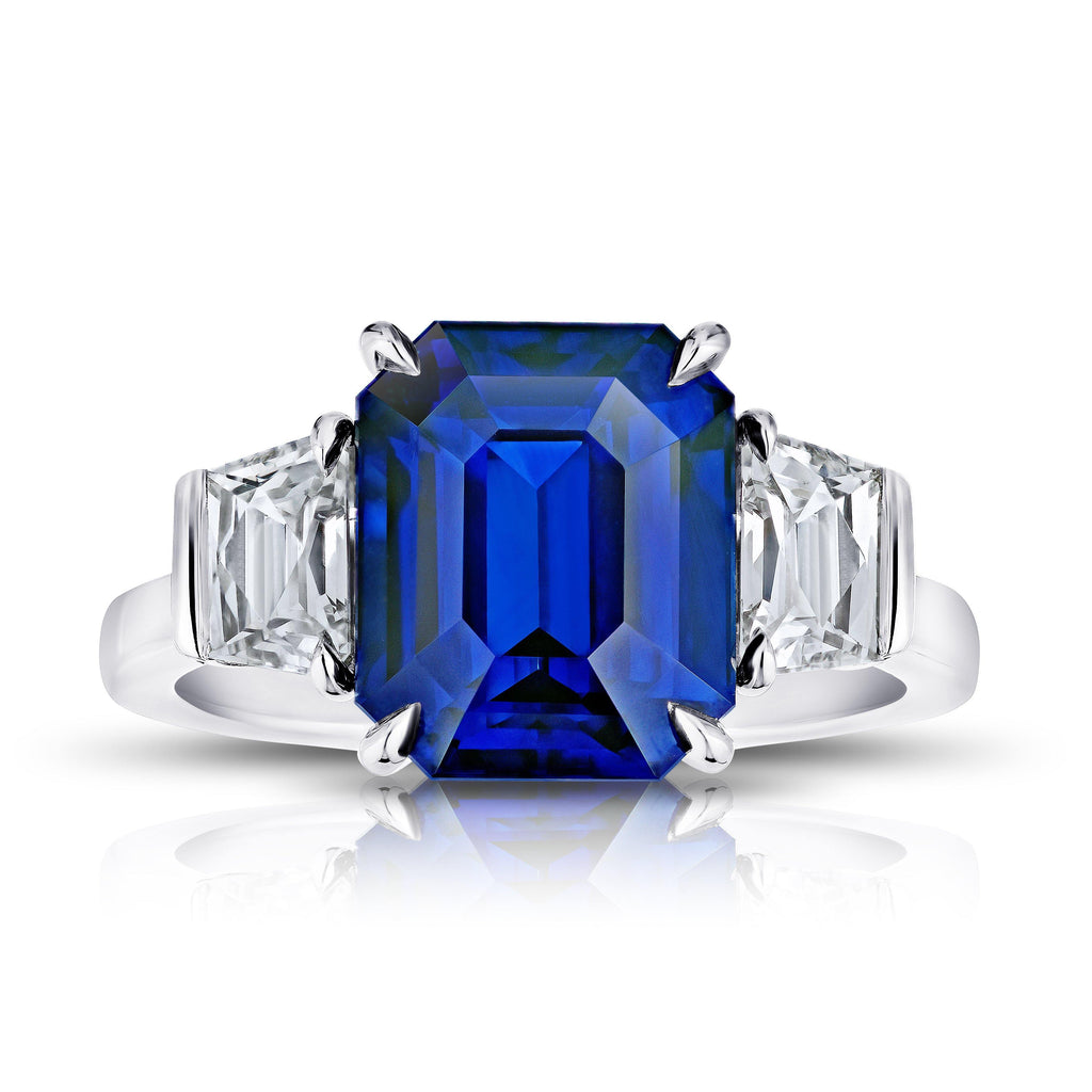Details5.98 Carat Emerald Cut Blue Sapphire with French Trapezoid Diamonds .96 Carats set in handmade Platinum Ring |