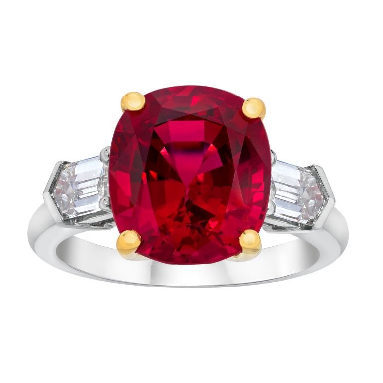 Details6.25 Carat Cushion Red Sapphire with 0.92 Carat Diamonds set in a Platinum Ring |