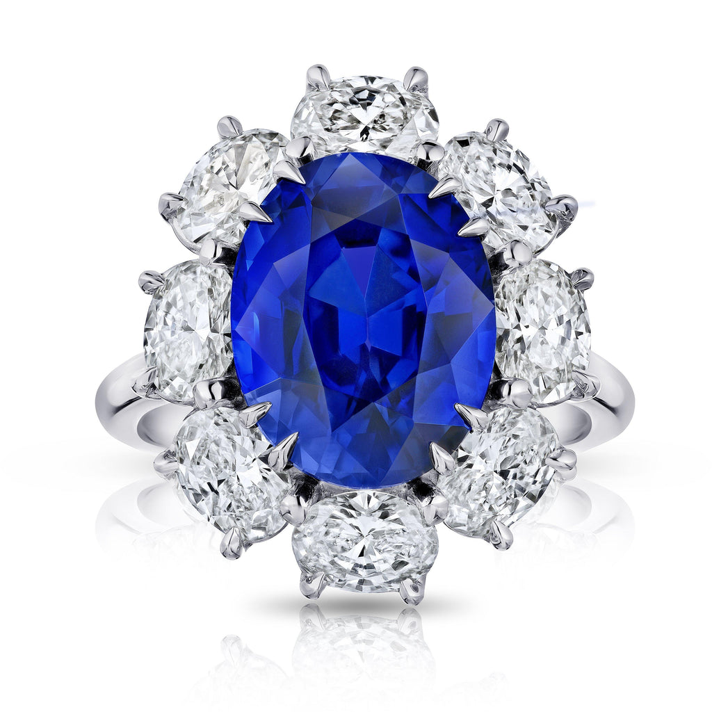 Details6.90 Carat Oval Blue Sapphire with Oval Diamonds 2.56 Carats set in handmade Platinum Ring |
