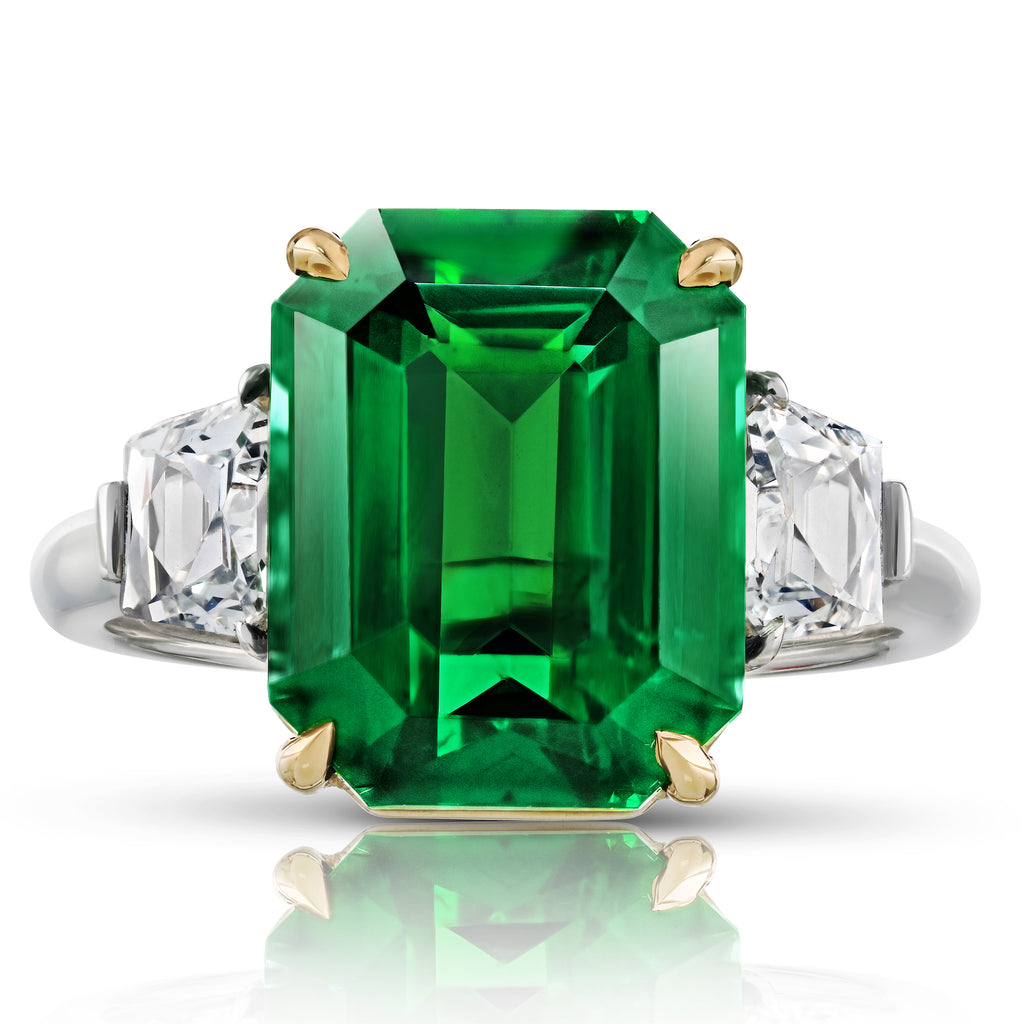 7.02 carat Emerald Cut Green Tsavorite with French Cut Trapezoid Diamonds weighing .86 carats set in a Platinum and 18k Yellow Gold ring.