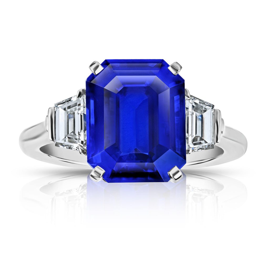 7.11 carat emerald cut blue sapphire with trapezoid diamonds .88 carats set in a handmade platinum ring