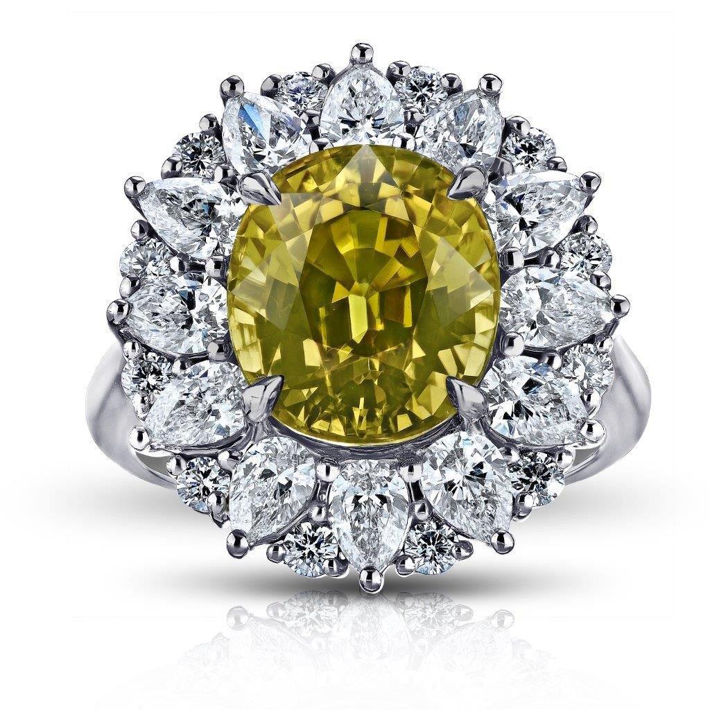 Details8.24 oval greenish yellow sapphire with 12 pear shape diamonds 1.86 carats and 12 round diamonds .37 carats set in platinum ring