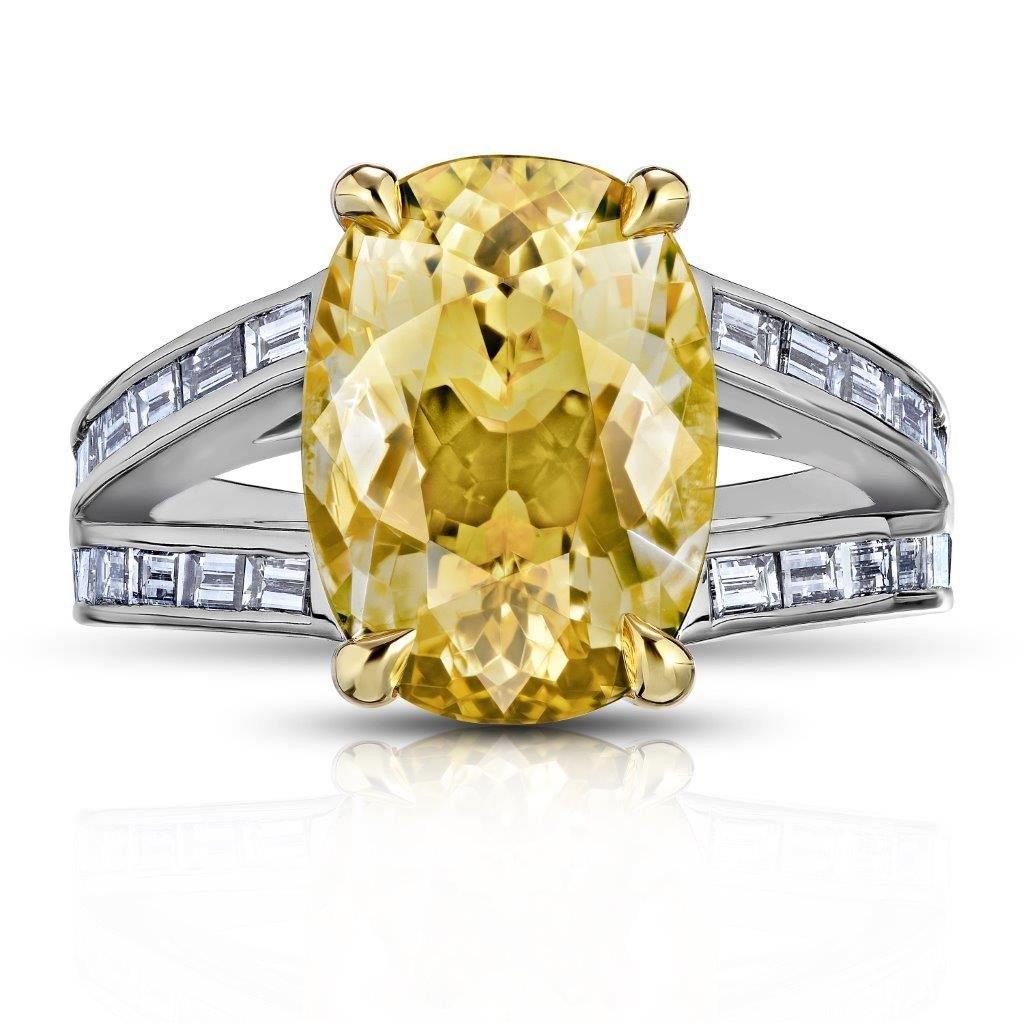 Details8.55 carat yellow cushion cut sapphire with 24 baguette diamonds weighing 1.00 carats set in platinum with 18k yellow gold split shank ring