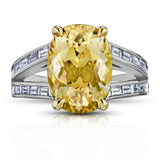 8.55 carat yellow cushion cut sapphire with 24 baguette diamonds weighing 1.00 carats set in platinum with 18k yellow gold split shank ring