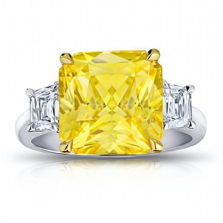 Details9.67 carat radiant cut yellow sapphire (no heat) with trapezoid diamonds .75 carats set in a platinum and 18k yellow gold ring