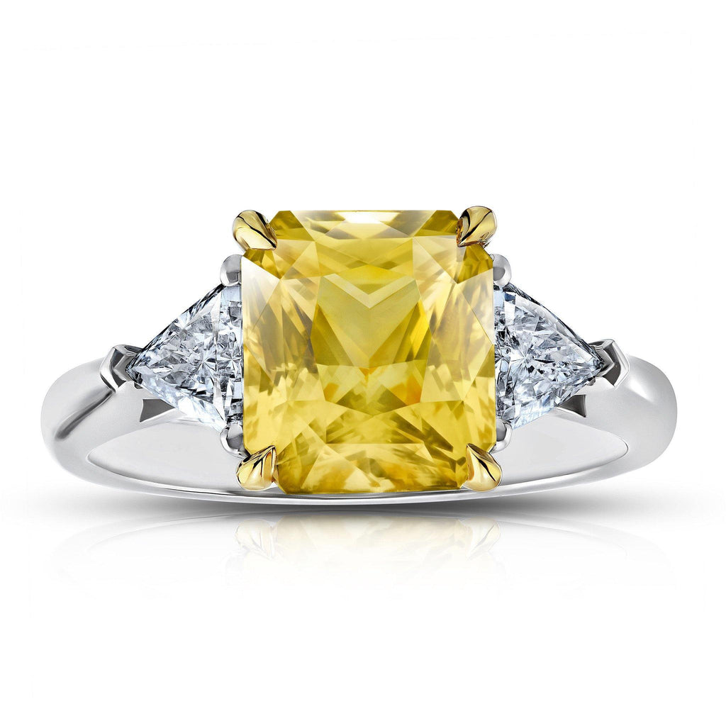Details4.59 carat Radiant cut yellow sapphire with trilliant cut diamonds .62 carats set in Platinum & 18k Yellow Gold Ring