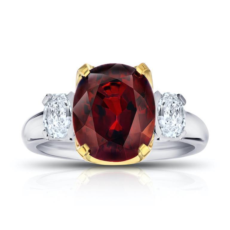 Details5.19 carat cushion (Burma) Red Spinel with cushion mixed cut diamonds .81 carats set in platinum and 18k yellow gold ring.