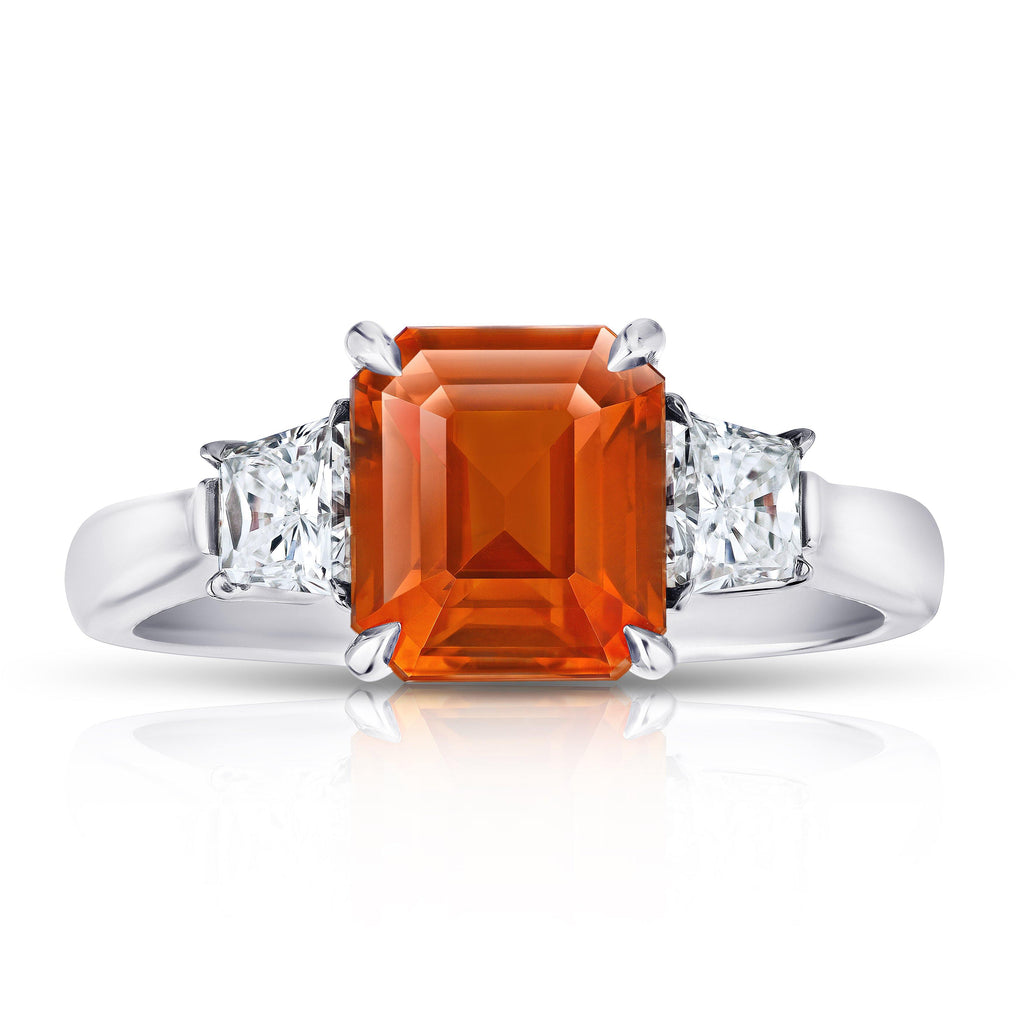 3.21 carat emerald cut orange sapphire with tapered radiant cut diamonds .63 carats set in a platinum ring