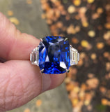 16.01 carat Cushion Blue Sapphire with two Trapezoid Step Cut Diamonds 2.79 carats set in a handmade Platinum ring