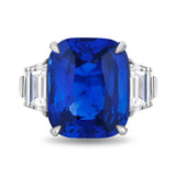 Details16.01 carat Cushion Blue Sapphire with two Trapezoid Step Cut Diamonds 2.79 carats set in a handmade Platinum ring  |