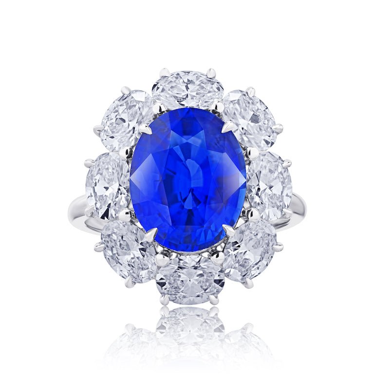 Details4.18 carat Oval Blue Sapphire with eight Oval Brilliant Diamonds 2.68 carats set in a handmade Platinum ring.
