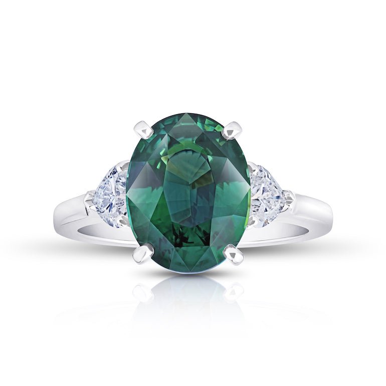 Details5.17 carat Oval Green Sapphire with Heart Modified Brilliant Diamonds .63 carats set in a Platinum ring