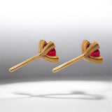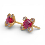 | Two matched cushion cut red rubies weighing .90 carats set with eight round diamonds (F+/VVS) weighing .16 carats in 18k yellow gold earrings |